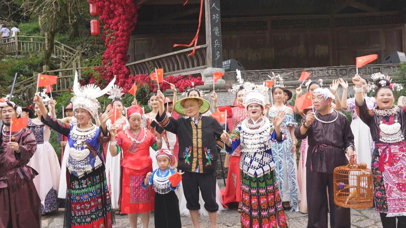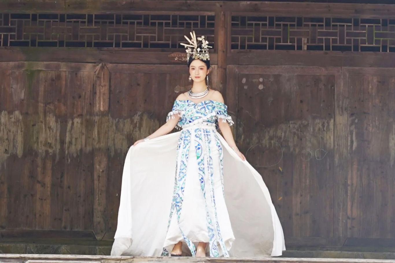 在云峰屯堡景区内的戏台上,“贵州村T”团队及当地民众穿着民族服饰、安顺地戏表演服装、凤阳汉装和带有苗族刺绣、银饰、水族马尾绣等非遗元素的时装新品依次登场展示。